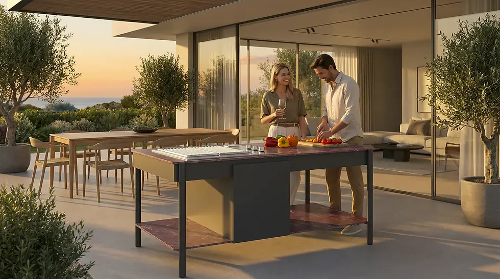 Notre cuisine Essentielle incarne l'alliance parfaite entre design épuré et performances techniques exceptionnelles pour l'extérieur. Conçue pour les espaces de vie outdoor les plus exigeants, elle transforme votre terrasse en véritable espace culinaire professionnel.